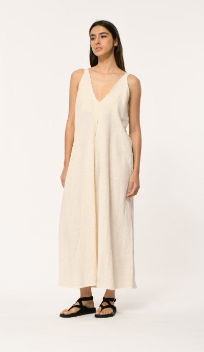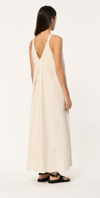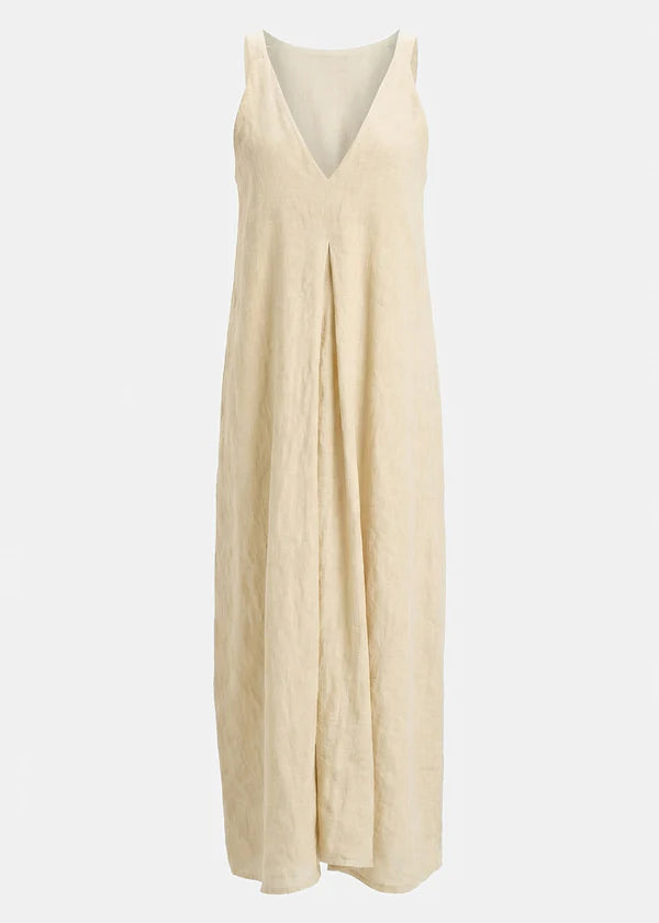 Long dress with straps in plain linen, V-neckline at front and back, inverted pleats at the front centre for a draped effect, flared shape and pockets on the side seam.