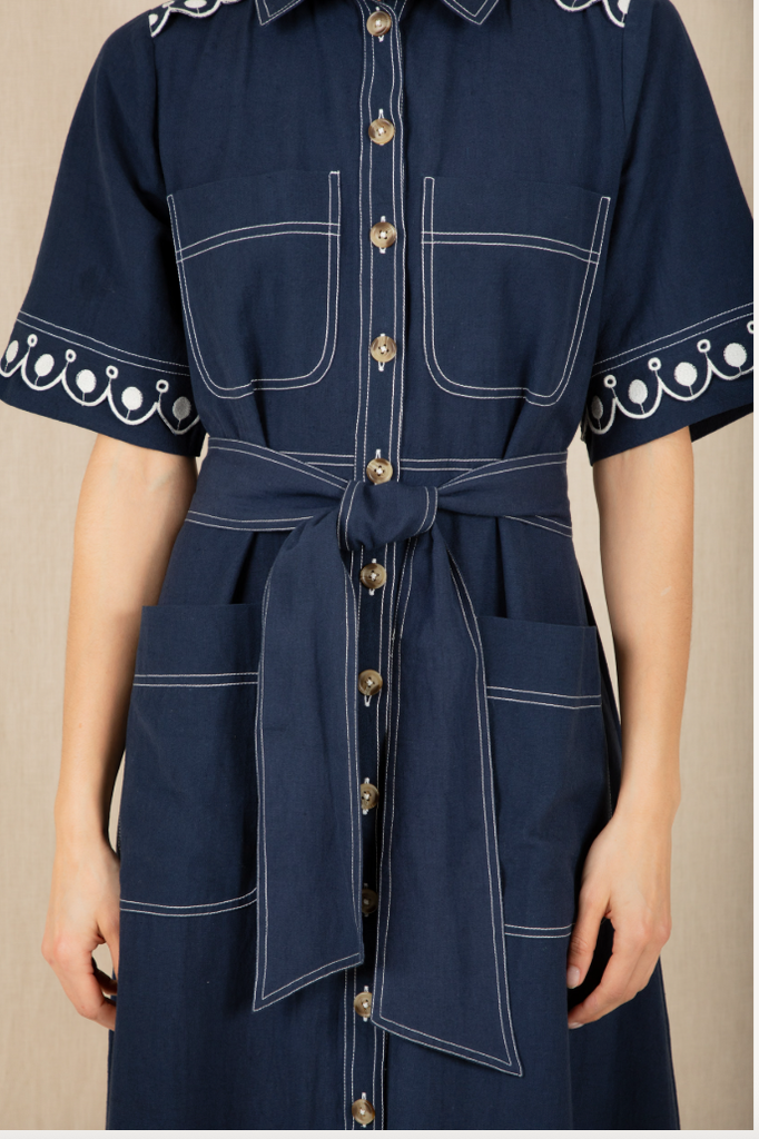 A twist on a classic button through shirt dress in cotton linen with a statement ecru contrast embroidery detail. The dress shape is loose + body skimming and can be worn with a belt for a more nipped in shape or without to keep it ways and relaxed.