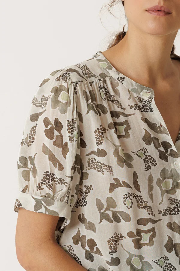 Short-sleeve, relaxed fit blouse with slightly puffy sleeves in shades of green watercolours. The viscose georgette fabric is slightly sheer. It has a standard fit, perfect for warmer days.
