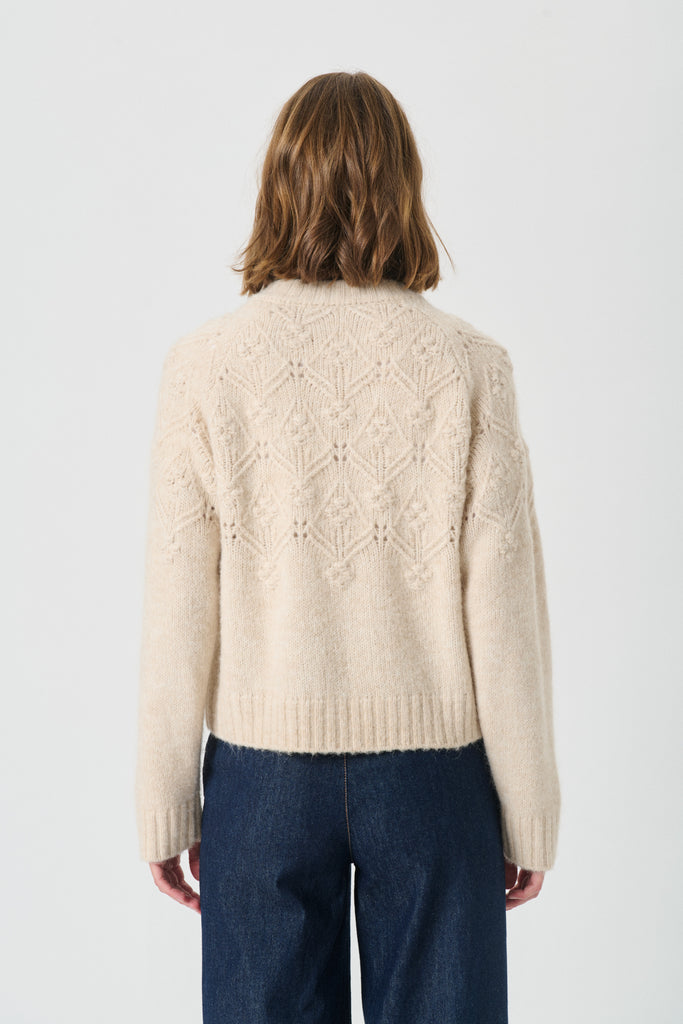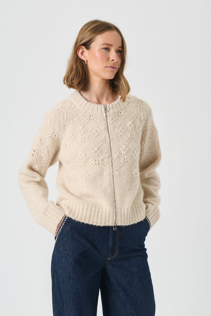 This wool-blend cardigan features a delicate knitted pattern and closes with a zip. The cropped fit and ribbed edges create a relaxed and feminine silhouette. Perfect over a simple tee or as an extra layer on cooler days. Pair with your favourite wide jeans or cords for an on trend look