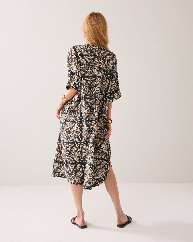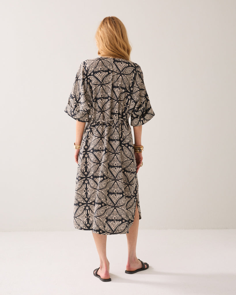 Dress in a supple viscose blend with a length just above the knee. The dress has a deep slit and can be worn both loose-fitting and more fitted with a drawstring, to the front or back. Dropped shoulder with wide cuff short sleeves.